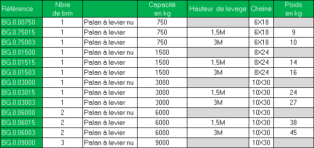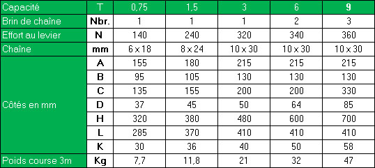 Ils sont disponibles en 750 – 1500 – 3000 – 6000 et 9000 kg (les deux dernières capacités sont mouflées en 2 brins de chaîne).